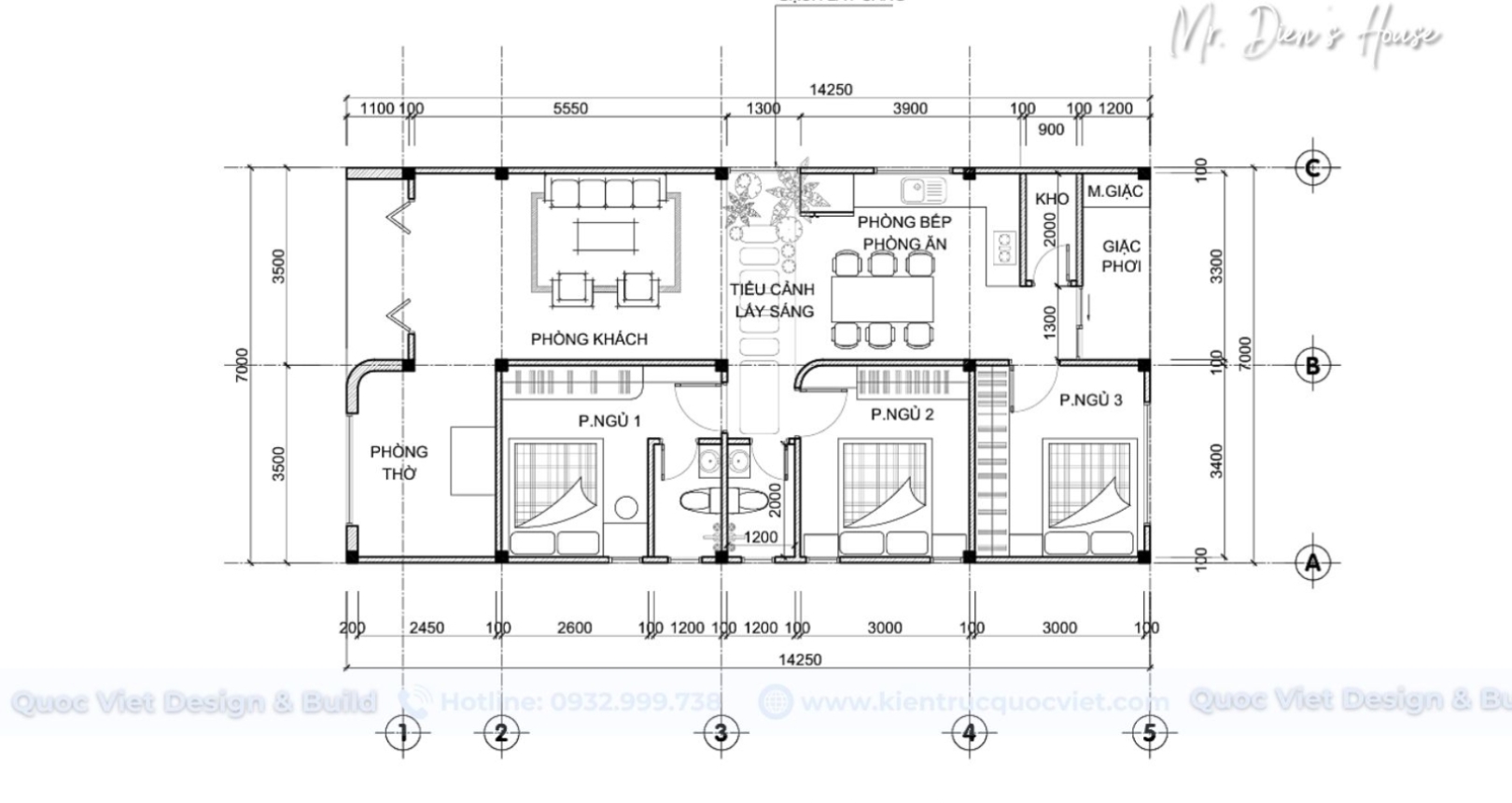 - Công năng: 1 phòng thờ, 1 khách, 1 bếp, 3 phòng ngủ, 1 kho, 2 WC